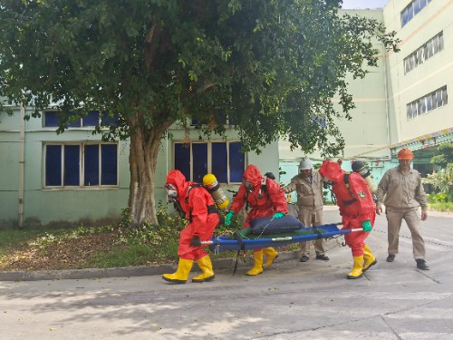 6月18日下午,一场设定为“原辅材料仓库代森锰锌自燃”的综合应急演练在车间区域展开。事故导致“浓烟滚滚”,一名仓管员处置时中毒昏迷。仓库主任迅速组织初期救援并上报。公司立即启动应急响应,成立现场指挥部,拉响警报。各应急救援队闻令而动,高效协同,迅速完成警戒疏散、伤员救护、消防稀释灭火、环境监测、雨水阀切断等关键任务,充分展现了应对复杂突发事件的综合能力。